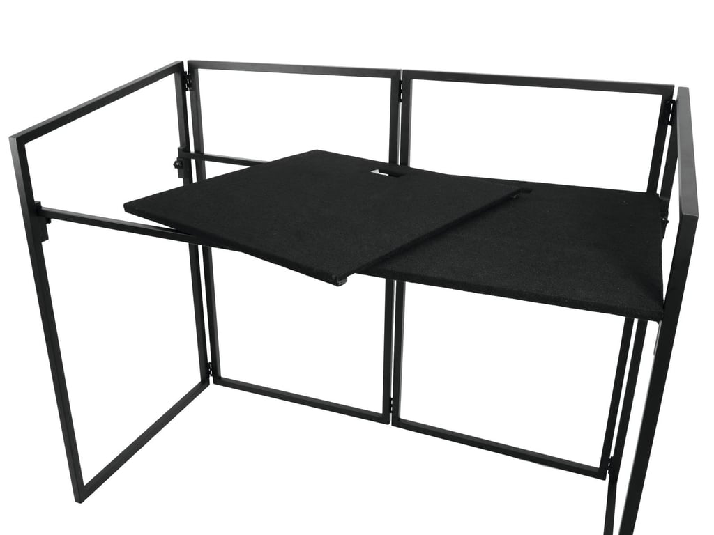 Support DJ de qualité semi-pro qui peut accueillir des tables de mixage, platines, contrôleurs, PC portables et autres. Démontable donc transportable, il est construit en acier solide et réglable