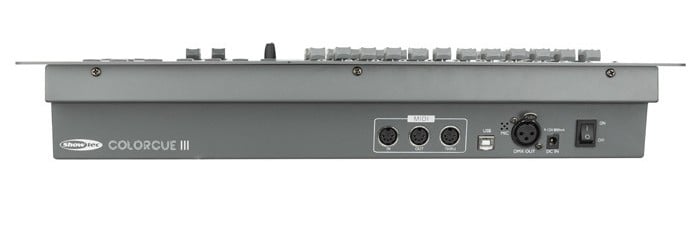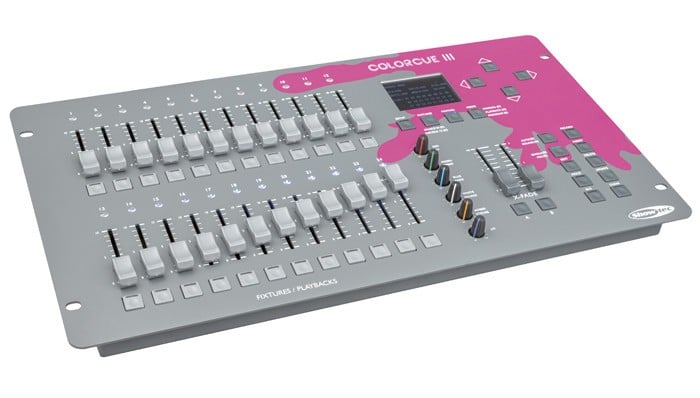 Le Showtec ColorCue 3 est un contrôleur DMX intelligent à 24 faders pour contrôler facilement 3 à 6 luminaires LED de couleur avec jusqu'à 144 canaux DMX, adapté à tous les lieux.