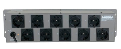 Switchboard 10 pistes avec boutons clignotants. Prises Schuko situées à l'arrière de 10 A par canal. Charge totale de 15 A.