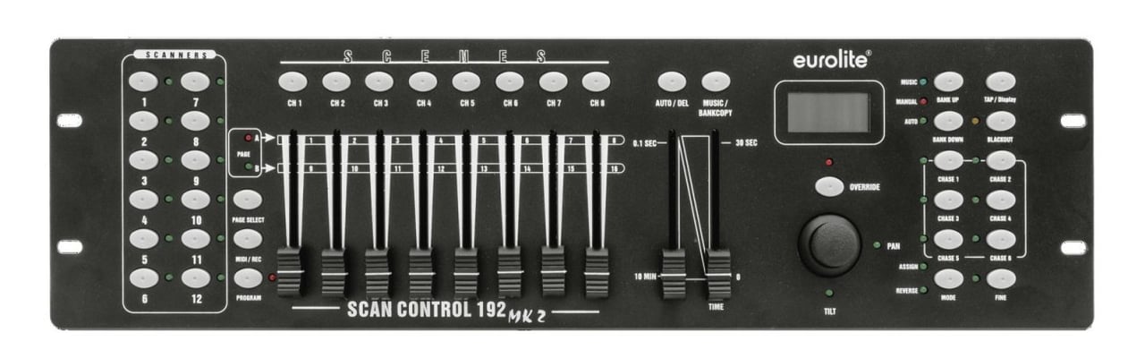 DMX controller for 12 lighting effect units such as moving heads, scanners and LED spotlights