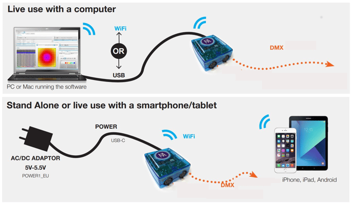 For 2 DMX universes (1024 channels), USB interface included in the delivery