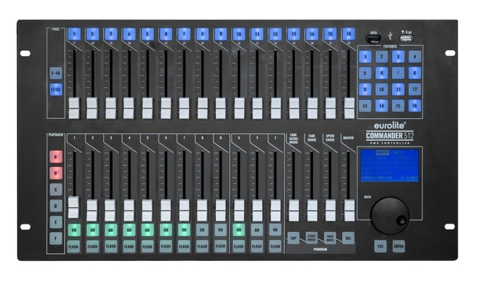 Modern theater lighting console for 512 DMX channels, separate dimmer faders for scenes & chases