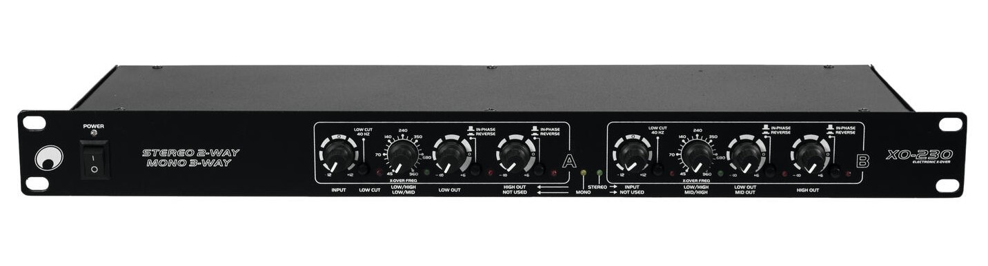 Filtre actif stéréo 3 voies/mono 4 voies avec limiteurs fonctionnant en stéréo 2 ou 3 voies et mono 4 voies.