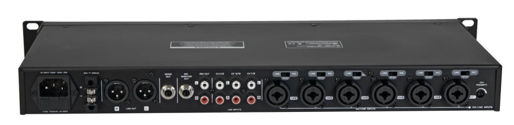 6 mono mic/line input channels (combo jack), switchable