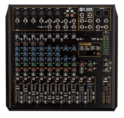 Console F 12XR de mixage, nombre d'entrées : 6 entrées micro avec préampli 4 entrées ligne mono (1 haute impédance), 4 entrée ligne stéréo, multi-effets pro DSP intégré avec 16 pré réglages, enregistrements et lecture stéréo via USB