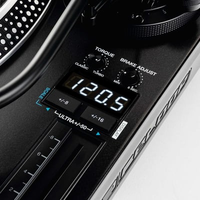 Spécificité unique de cette platine : les options multiples de contrôle du tempo. Outre une largeur variable standard de ±8 %, vous pouvez aussi sélectionner une largeur variable de ±16 % et ±50 %. Un simple bouton de reset du tempo réinitialise la vitesse de rotation fixée à ±0 %.